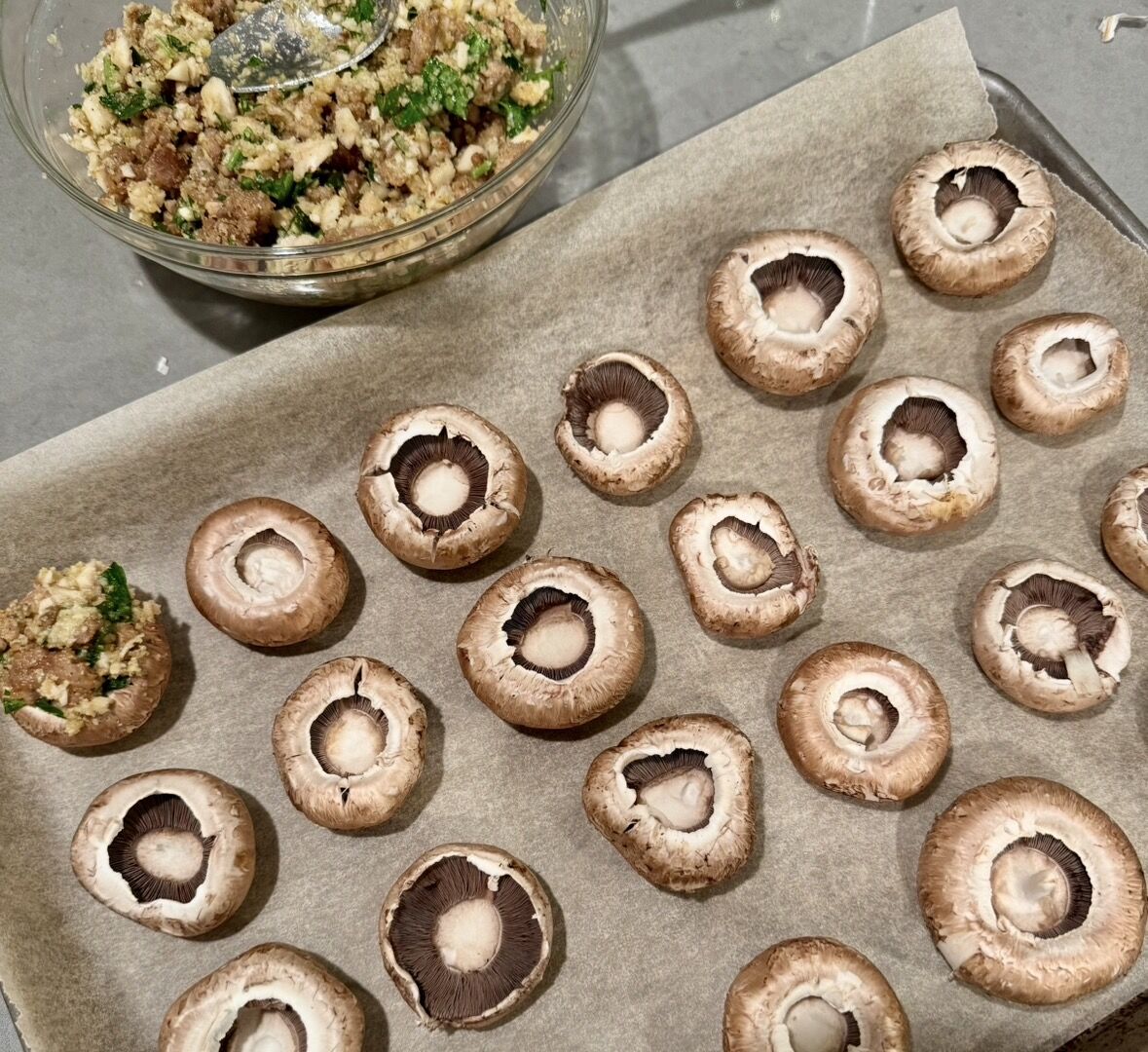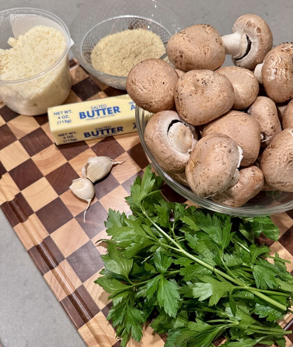 - Mince mushroom stems and add to a bowl with the cooled sausage, breadcrumbs, parsley, Parmesan and garlic. Pour the melted butter over and mix until evenly incorporated.